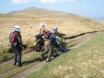 After a long and unpleasant battle with the holiday traffic on the M5, Mike, Simon and I finally arrived at a pub in Machynlleth on Friday evening. The other half of the group - Terry, Fred and Bonny - had arrived earlier, hooked up with Liz who had driven from Scotland, and we all sat down for a meal and a few beers. At this point we were told that Bonny had arrived without her bike - the poor Serow had deposited the contents of its petrol tank into the sump somehow, and despite a last minute effort from Jeff it was not fixable in time, so rather than miss the trip altogether Bonny decided to come anyway. An early start was in order for the next morning, and after a hearty breakfast, superbly prepared by Fred and Terry, we were off and running shortly after 8.30. 2 miles of road, then into the first lane. Mikes new to him KLX was the only bike to be wearing a knobbly tyre, and this was blamed for his failure to conquer the first real obstacle - a short but savage rocky climb out of a stream bed. After a little bit of flailing about and a helping hand from Liz he got up it - as we were to discover, Mike was due to have "one of those days" through no fault of his own. After a quick fuel stop the real fun started, with a seemingly endless blur of superb lanes in the most stunning environment. The views were astonishing, with mountains one side and the sea the other, the lanes although few in number were very long - I dont know for certain but I'd guess at times there was an hour of off road with no tarmac at all. I wont go into endless detail - I'll let the many photos tell the story, but suffice to say it was a spectacular days riding, with many highlights. Mikes "day" continued with only puncture of the weekend. The usual tyre changing committee got the job done with little fuss, although Freds farting pump caused the more childish amongst us alot of amusment. We rode across the bridge at Barmouth - a mile long foot and rail bridge across the mouth of the estuary, also open to bikes. A few funny looks from the pedestrians, and Fred got into trouble for climbing on the toll keepers garden wall trying to shoot a video. Towards the end of the day we were searching for a lane which Liz had not ridden before. Up through the forest and out into the open was quite straight forward, but the path seemed to just peter out after this. Knowing roughly the direction we were going, we set off across country to try to find a way through. This is where we encountered our first and only real bog, just a few feet from the hard surface of the trail. Initially it was only a narrow strip - Liz battled across it, only to come to a halt after a dozen or so yards. I followed, and managed to make it a little way further before sinking to a halt. At this point Mikes day hit its peak. Urged on by the rest of the crew, because he had a knobbly tyre on, he hit the narrow strip of bog at speed, hoping momentum would carry him over. Sadly this wasnt the case , his front wheel sank, his bike stopped dead and Mike was catapaulted over the bars. I'll let someone who saw it happen describe it later perhaps, but after they realised bike and rider were ok the was a lot of laughing. The next half hour was charnage, as everyong battled across to harder ground, only to have to turn round and battle back. I think everyone got stuck at some point, some of us more than once, and after much pushing and pulling and sweating we gave it up as a bad job and went to the pub for a beer.
