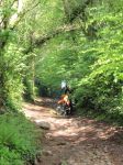 Just a quickie on the day out with the visitors from Wiltshire. Arriving in Ivybridge to a car park full of bikes, I ended up with 5 riders who wanted a busy brisk day out. So with Mike and Simon, who shared the role of TEC during the day, that made 8 of us. 2 KTM 4 strokes, 1 KTM 2 stroke, 1 KLR, 1 Husaberg, 1 CRM 250, 2 XR 400's - one with magic button, one without. So, unusually, the kickers outnumbered the electric boots 4 to 3. As it turned out this really wasn't a problem, we didnt have a single delay in that respect all day. First drama of the day occurred five minutes in, when Mr Husaberg stopped us before we got our first lane complaining of hideous metallic clattering coming from his engine. After a brief conflab he decided to pull out and return to his car - the right decision, I think, as it sounded terrible and certainly wouldn't have survived the day. Poor bloke, came all that way for 5 minutes on the roads round Ivybridge!!! Quick easy lane to start, then it was straight to the Devil's Steps - chuck 'em in at the deep end and see what we're dealing with! Considering they are all used to riding flat, chalky, stuff they all did brilliantly. KTM 2 stroke had a little lie down near the top, and XR kicker had a bit of a struggle, which stopped Mike in his tracks and made it difficult to get going again, but they all got up it. Much grinning and sweating at the top. But it was clear to me by now that they were all competant and up for it, so off we went. The route I'd plotted took in all the lanes I know well, the aim being to give them a seamless and flowing day out , with minimal tossing about looking at maps and going the wrong way. I think I managed to pull it off, getting to almost 4 o'clock before the map came out, and that was only because time was running out and I wanted to cut a little bit out to get them back to Ivybridge nearly on time. They took to the second man drop off routine pretty swiftly, which helped a lot. In total we did 81 lanes, not counting a couple we went up and back again, and covered about 130 miles. Being at the front all day I can't say for sure, but I don't think anyone had any offs after the Devils steps, in fact the standard of riding was excellent, the whole group being right up my chuff whenever I looked round. Add to that they were all really nice blokes, made it an excellent days riding. I think they all enjoyed themselves immensely, judging by the amount of hand shaking that went on at the end.