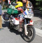 Yesterday I got a call from my friend Rob (English fellow who owns a B&B in town) to say that we were going to get a special visitor. Evidently our local bike shop in Calgary has another Englishman working there who sent this fella in our direction for a cup of tea and a chit chat. His name is Ian Coates and if you haven't heard of him yet, you will do. He's all over the net and stems from Hebden Bridge in Yorkshire. He went out for a 4 month holiday on his Africa Twin and just kept on going. He hasn't been home in 10 years! He's visited over 60 countries by bike, he's 66 years old and is just about to head to Alaska, ship the bike accross the Bering sea and start on Siberia,Mongolia, Pakistan, China and the rest of the sodding Continent! He's racked up a whopping 138,000 miles on the bike and only ever replaced the cam chain. His bike is now very tired and he's asking if anyone has any contacts with Honda UK because basically he'd like to get some free parts from them to fit soon. He's not asking for much either. Just a few fork seals, piston rings and general stuff that will allow him to continue this trip on the same bike back to Yorkshire. Wouldn't this be a great advert for Honda? If anyone out there has a contact please let me know. I will be riding with him for while in the Whitehorse area and should be able to pass on any info he needs. He has no mobile phone, GPS or any other means of communication at all and relies on the odd phone card to contact his wife from time to time. Basically his efforts put the Long way round/down crew to a much lower level and he's done it all himself. Once i a while the BBC or MCN catch up with him for an interview when they can find him. When I asked him what his Wife did back in England he replied "she stays back "ome and pays t'credit card bills" Incredible.....he truly is an inspiration when you talk to him and ......he's such a smashing bloke too!