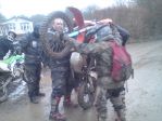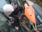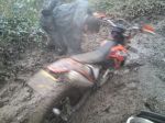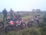 Justin's route was approx. 100 miles and 60 miles in and at approx 15:00 we approach the western end of 202-007. I'm about third in the group and follow Justin and rider No.2 through the first two puddles, each one getting deeper. Justin enters the third puddle and gets about 20 feet in then he's literally up to the tank, rear No.Plate touching the water! Engine killed he admits defeat and eventually manages to push it out. We spend the next 30 odd minutes taking the plug out and clearing the water from the engine. Put back together it sounded like it was going to fire off the button so we don our kit, do a 180 in the lane and head out the way we came in. Well, we did, Justin didn't! It wouldn't go so we then bled the carb to remove any remaining water, still no good. We push the bike out of the lane to meet the rest of our gang and two 4x4's waiting for us to clear the lane. We then spend the next hour or so trying to start the bike. Battery now dead a few people have a go at kicking it over. Having removed the nut off the bottom of the bowl this revealed fine debris and water. Back together and it fired a few times but when attempting to blip the throttle it just dies. We're all thinking a jet is probably blocked with some fine grit. We decide we'd tow the bike to the A38 where Justin would ring for someone to collect him. This didn't go so well either with Shaun trying to bump the bike whilst being towed which resulted in him binning it on the A383 almost as soon as we hit that main road. Not the best scenario with fast flowing traffic, Ooopps So, I then push him along via the footpeg as far as the Halfway Inn, my groin muscle was shot by this point. We all admit defeat and leave Justin and Dave in the carpark. One of the other riders was going to head back to Plymouth, pick up his van then return to collect the guys. They made it home fine.